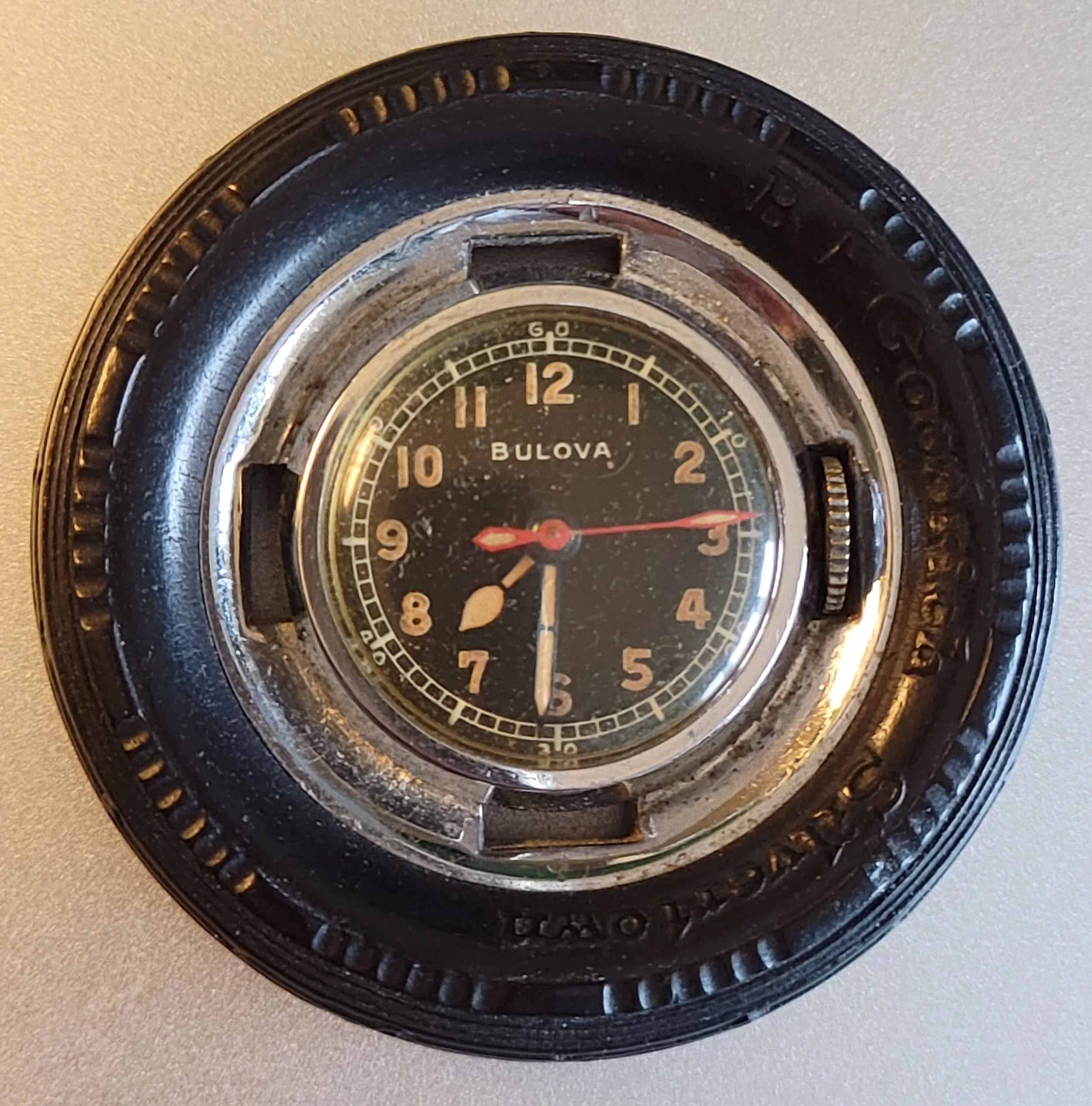 Grandpa Roberts worked for B. F. Goodrich, and in 1944 the company issued a promotional Bulova watch, set inside a miniature version of its Silvertown rubber tire. “B. F. Goodrich ‘First in Rubber’” encircles the watch’s case back, with the company logo in the center. At some point, I acquired this watch, too.