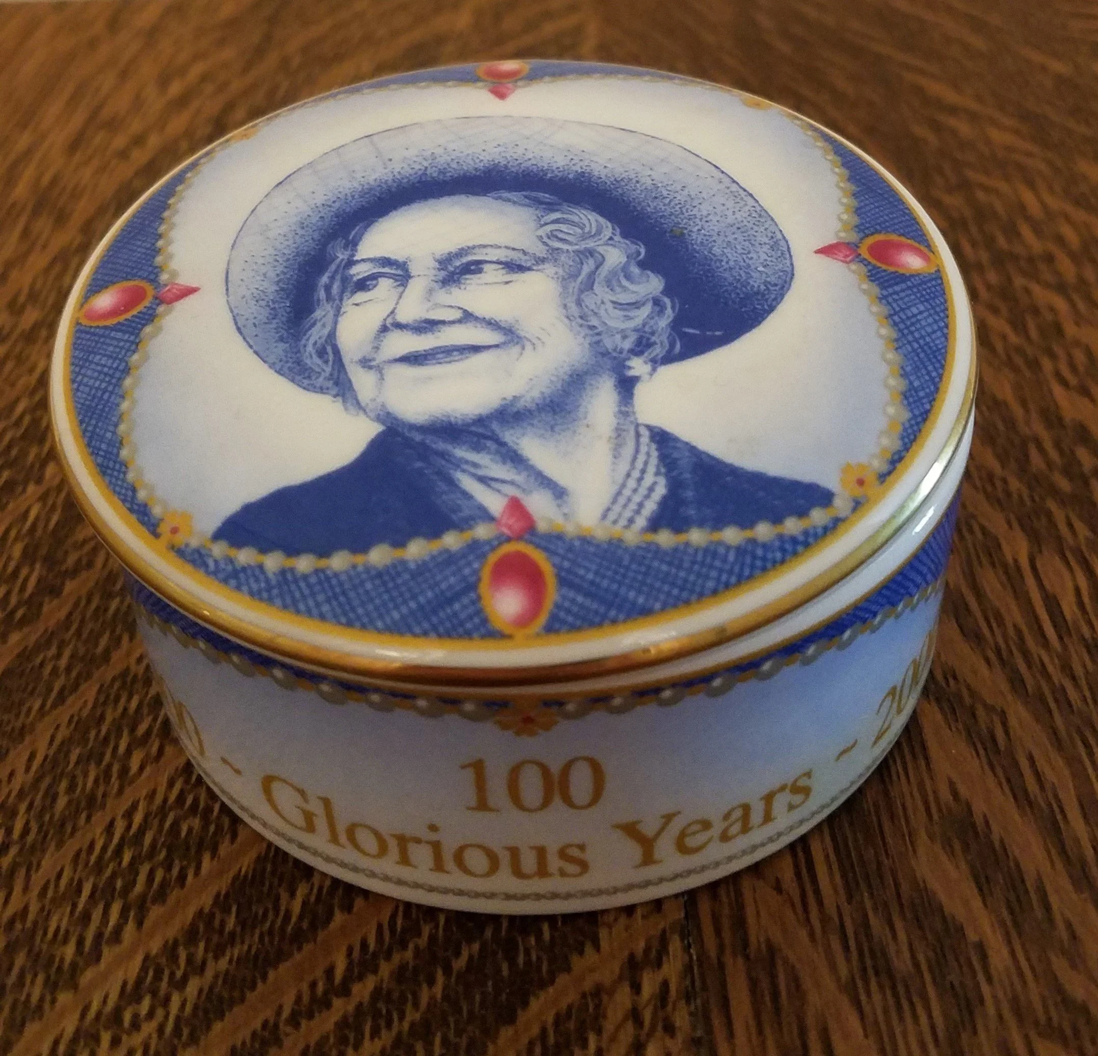 I picked up this covered dish commemorating the 2000 centennial of the birth of England’s Queen Mother at a vintage home goods store I liked to browse. It reminded me of my semester in London during Queen Elizabeth II’s Silver Jubilee year. When I mentioned that to the proprietor, she had her own memories of long-past time in England. Without regular employment there, she sold items at car boot sales to earn some cash and saw that as the precursor to her current shop.