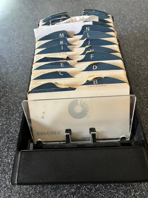 Searching through some old boxes in the basement, looking for a specific photo album, I accidentally stumbled across my old Rolodex. It was wedged tightly along the side of the box. I yanked it out and sat down on the cold tiled basement floor. The alphabet tabs, now tattered and tired, were a perky periwinkle blue that stood at attention when new. Flipping through the Rolodex was a flashback of my “then life.” Each entry tells a story.