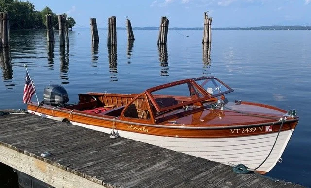 It was Summer 2006, and I was heading into Burlington, Vermont, on Rte 7 when I passed a woman’s clothing store, Lady Shelburne. In the parking lot was a beautiful old wooden boat on a trailer, with a for sale sign on it. Somehow my car turned into that lot all by itself. I got out and walked around the boat.