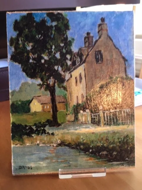 Later in our acquaintance he told me about his painting. He called it a hobby, but when he offered to show me a couple, I was astonished to see they weren’t at all amateurish, but lovely little oil scenes on particle board. When he said he would like me to have one, I hesitated - about a nanosecond - before accepting with heartfelt gratitude. The one I chose was a four by five-inch painting of what looked like a French farmhouse by a quiet stream. And for years it has greeted me each morning as I sit at my desk.