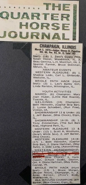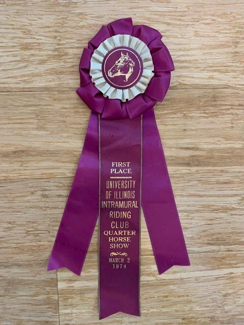 Illini Chubby and I won this ribbon in a western-style quarter horse show on March 2, 1974, at the Armory in Champaign, Illinois, when I was 14 years old.